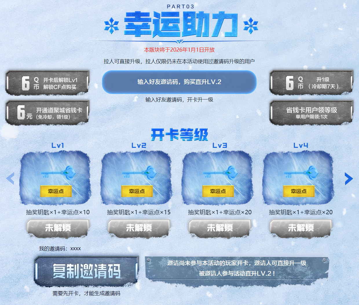 输入邀请码6Q币开卡直升2级可领取2把抽奖钥匙+25幸运点满级可领取7把抽奖钥匙+140幸运点