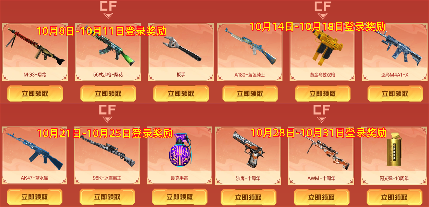 活动时间:10月8日-10月31日电脑地址:https://cfhd.cf.qq.com/cp/a20241001weekact/index.html手机地址:https://cfhd.cf.qq.com/cp/a20241001weekact/m.html