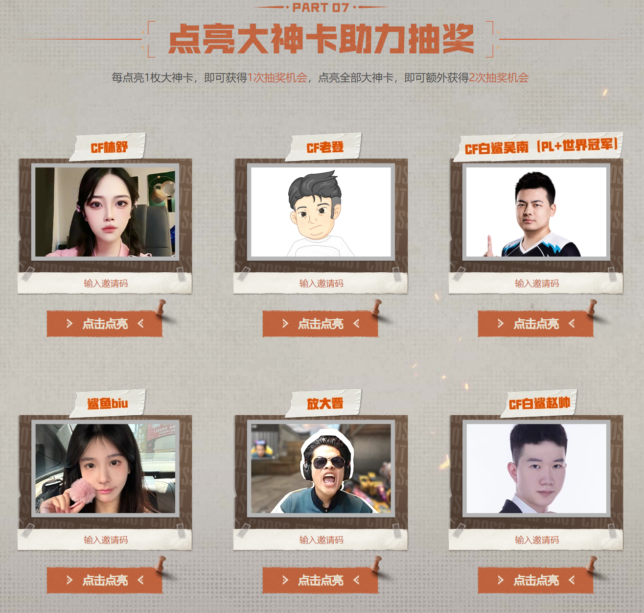 输入邀请码点亮大神卡获得抽奖机会CF林舒:Q9318CF老登:laodeng666CF白鲨吴南:bswunan鲨鱼biu:Q9606放大晋:YM666CF白鲨赵帅:BSzs666